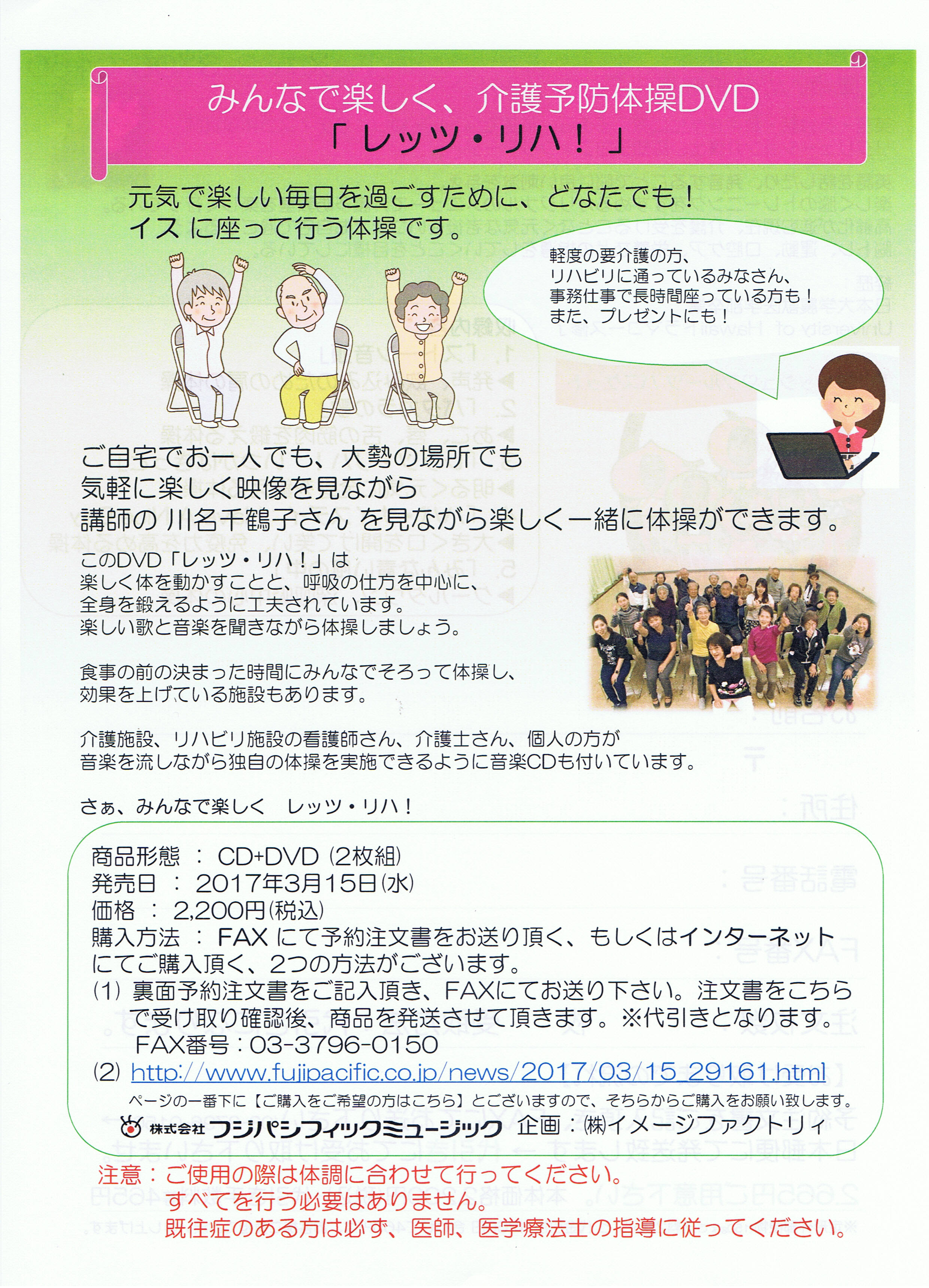 介護施設、リハビリ施設の看護士さん、介護士さんたちが、ノウハウを用いて独自の体操を行ってもよし、また、個人の方がご自宅等で音楽を流しながら独自の体操を行ってもよし、そんなDVDとCDに出来上がっています。