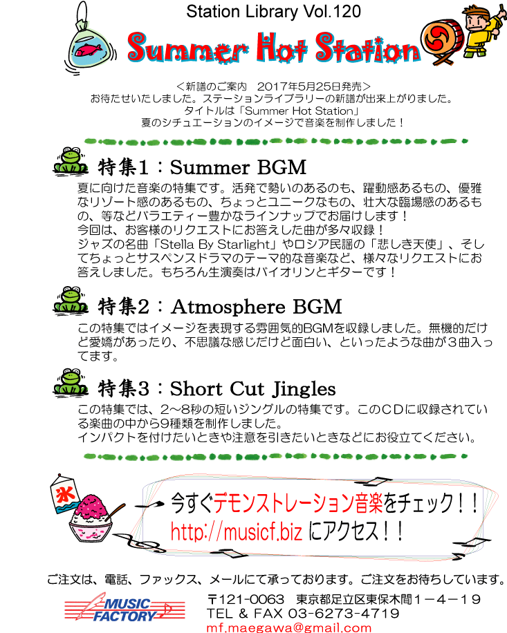 | 夏をイメージしてお届け!爽やかなものからギラギラ暑いものまで、幅広くお届けしています。定番のギターとヴァイオリンはもちろん生演奏。そして今回はチェロも参加しての生演奏です! | ||||