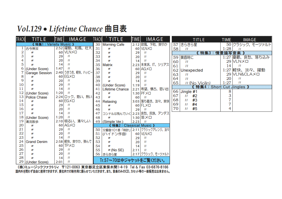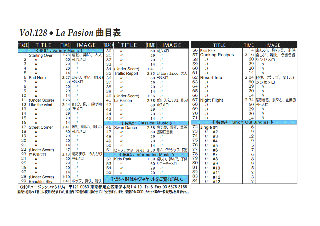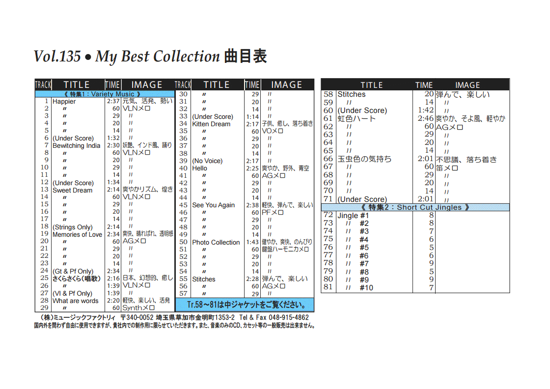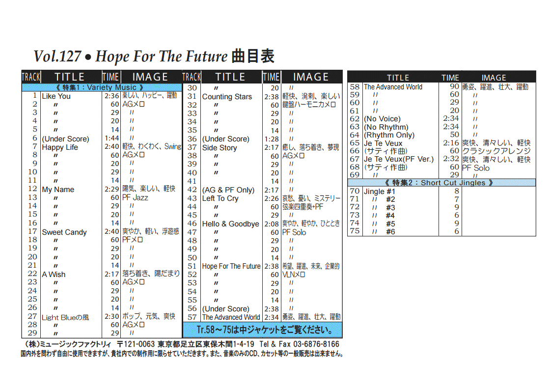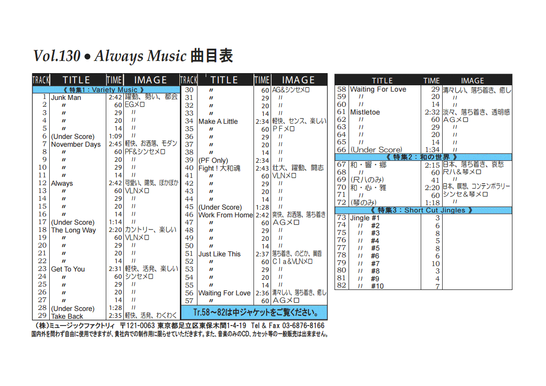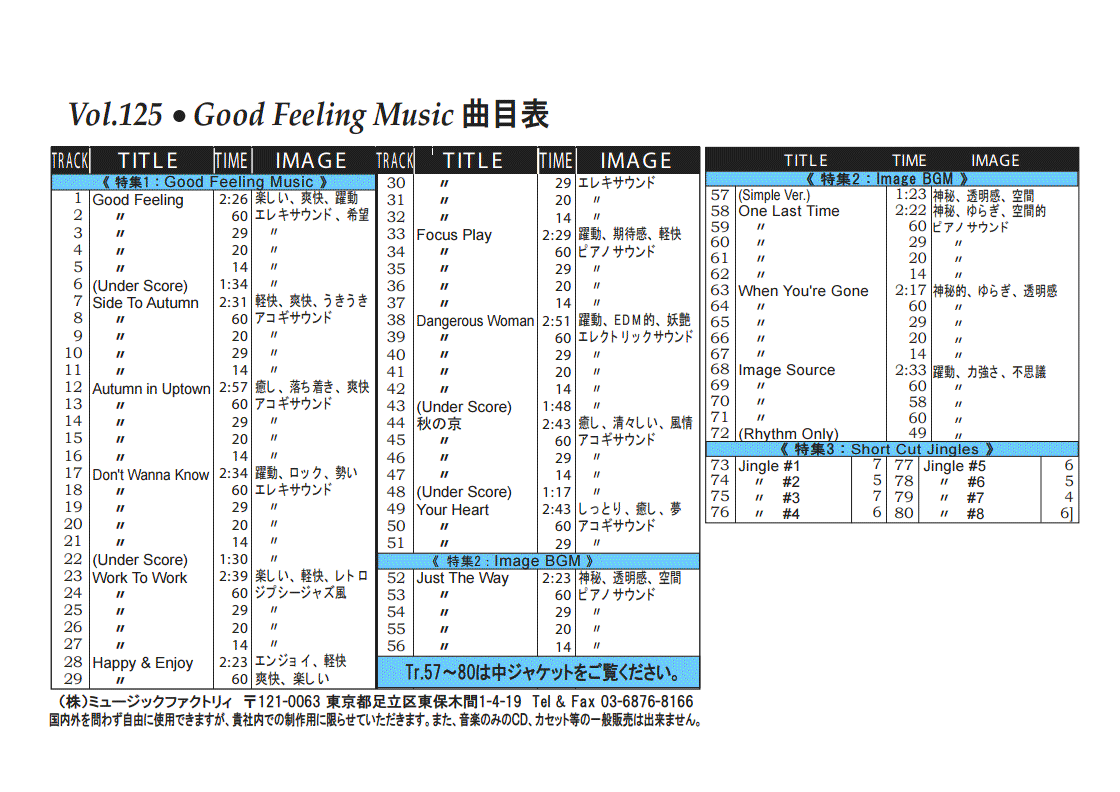 ・Vol.121 Beautiful Autumn ・Vol.122 Happy New Style ・Vol.123 Go to New Season ・Vol.124 Summer Tension ・Vol.125 Good Feeling Music ・Vol.126 Silver Lining ・Vol.127 Hope For The Future ・Vol.128 La Pasion ・Vol.129 Lifetime Chance ・Vol.130 Always Music