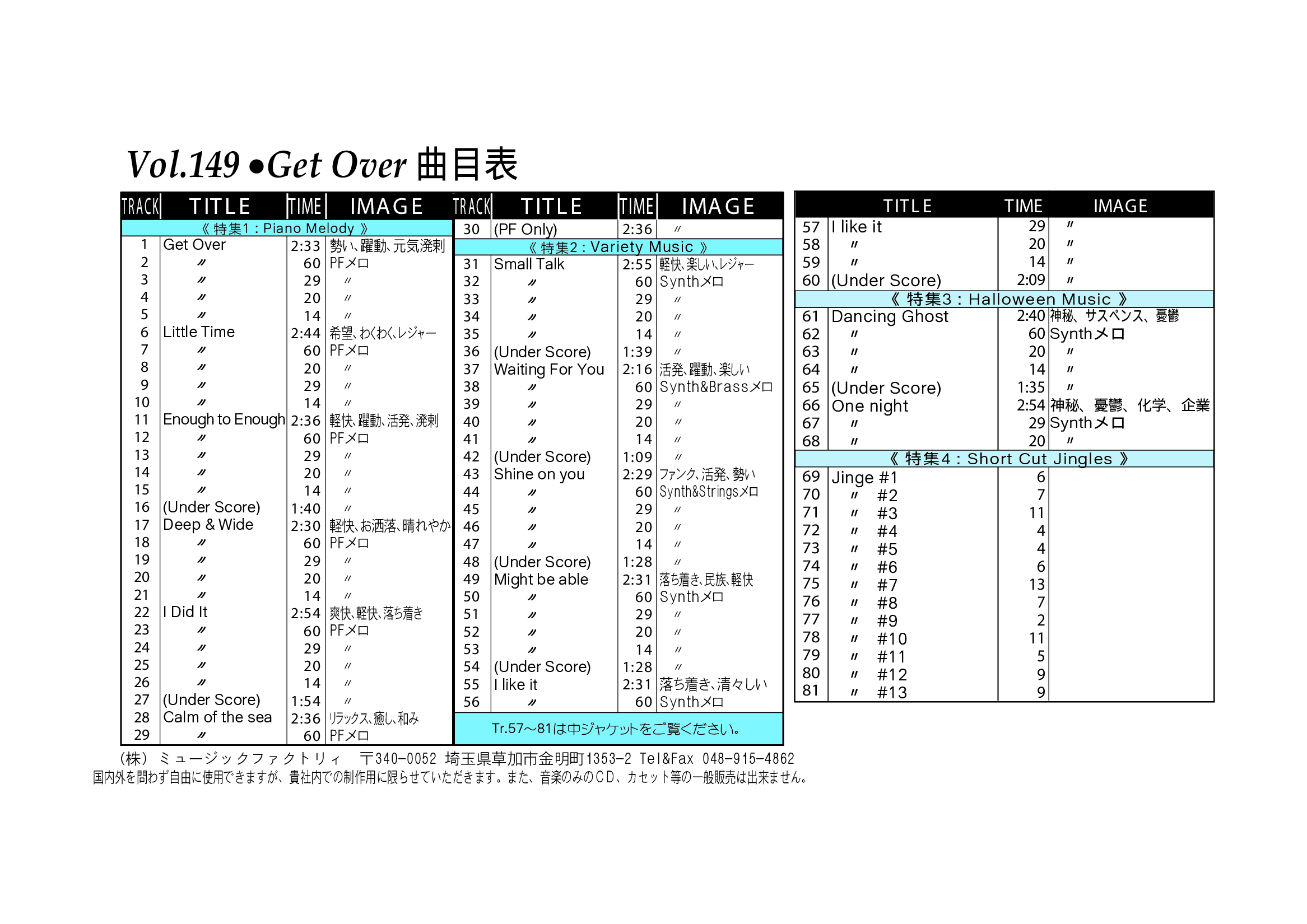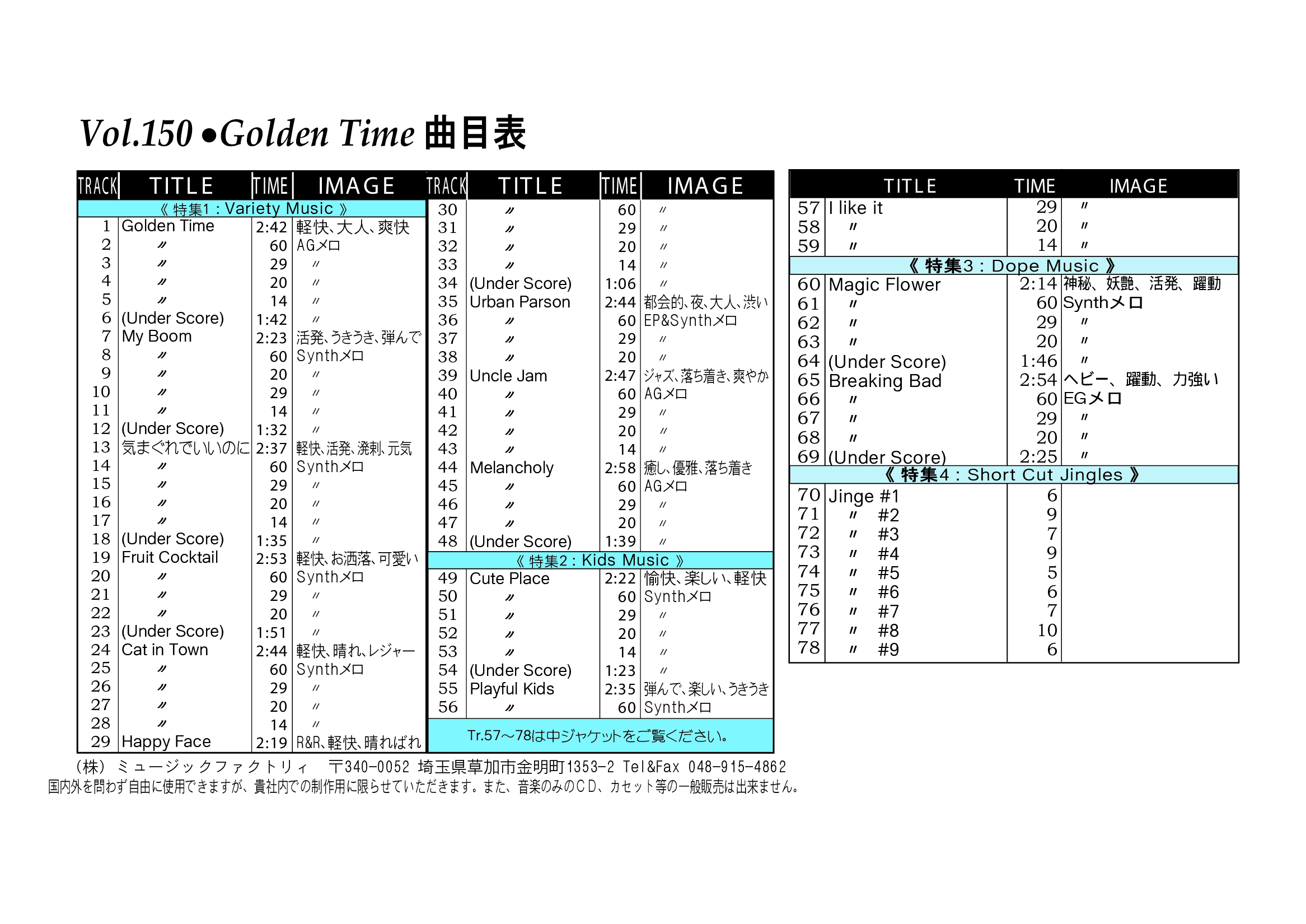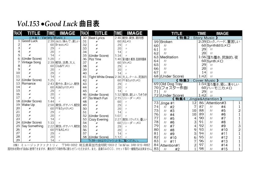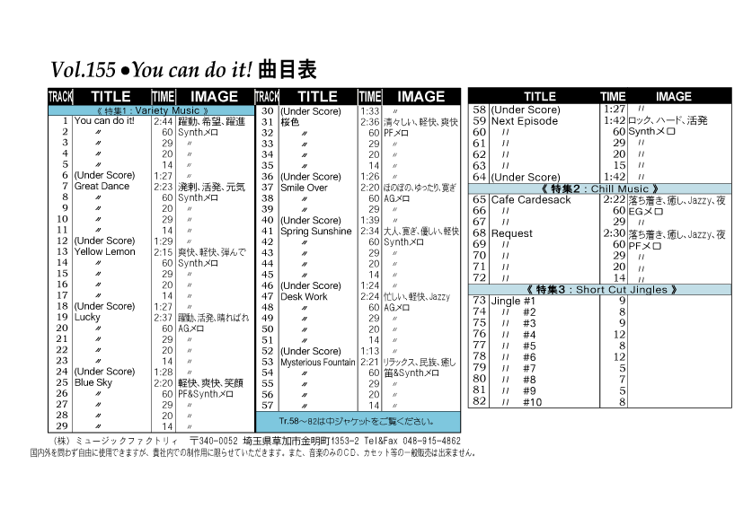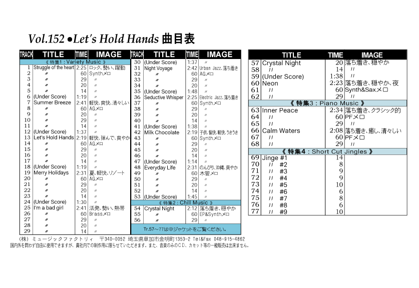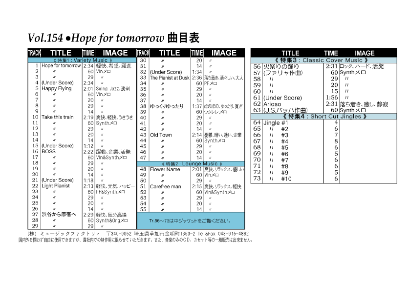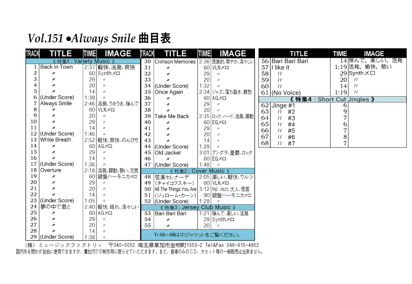 ・Vol.121 Beautiful Autumn ・Vol.122 Happy New Style ・Vol.123 Go to New Season ・Vol.124 Summer Tension ・Vol.125 Good Feeling Music ・Vol.126 Silver Lining ・Vol.127 Hope For The Future ・Vol.128 La Pasion ・Vol.129 Lifetime Chance ・Vol.130 Always Music